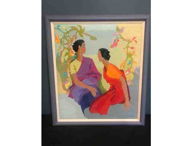 The piece features two women conversing. Jewel toned colors in a 27x23 blue frame.