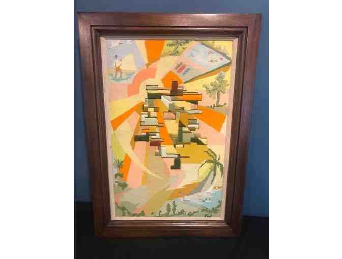 The 30"x21" wood framed needlepoint art comes in orange, moss green and yellow tones.