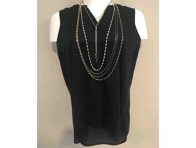 Adding more elegance is this Stella & Dot Terney Layered Necklace. Six strands all in one style. Black and blush enamelled strands mix with semi shiny gold chains. A stylish beaded lariat with a genuine leather detail perfectly nests between delicate ball chain chokers and the base strands. Wear each strand separately or mix and match to fit your look.