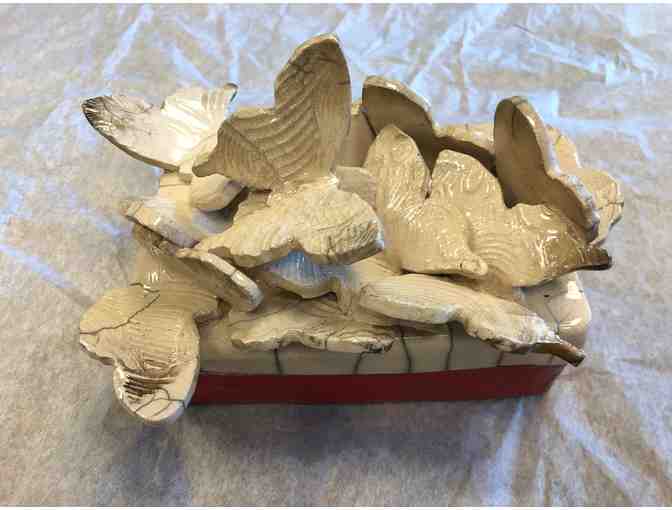 This beautiful ceramic stoneware box was handmade by our very own Lisa Goldfarb! It features a red base and a white lid topped with butterflies. The box is made in the raku style and decorated with underglaze.