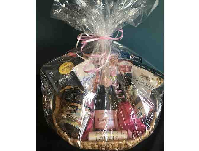 Basket of Sparkling Rose Champagne, 9 salty snacks, 1 sweet snack and napkins.