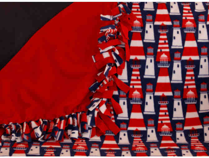 Stay warm with this cozy fleece blanket! This handcrafted blanket features a red, white and blue lighthouse theme and hand tied fringe ends. The reverse side is a solid red color.