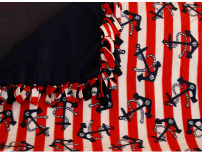 This cozy nautical themed fleece blanket makes a great lap blanket or kids blanket! This handcrafted blanket features a red, white and blue nautical anchor theme and hand tied fringe ends. The reverse side is a solid navy color.
