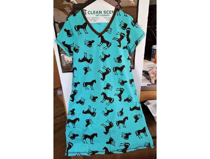 You are bidding on a 100% cotton shirt by Lazy One. The shirt is a size small. The sleep shirt is blue with brown horses. Really cute.