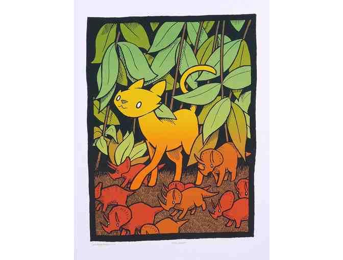 Signed and numbered edition. 18"x24". Four screens on French Speckletone cover stock. Jay Ryan is a poster maker and rock musician. He is noted for his squirrel posters as well as being a bassist in the band, Dianogah. Working in Skokie, Ryan produces limited run, hand-printed posters for rock bands, concerts and art shows. Most of his work is screen printed at his print shop, The Bird Machine.