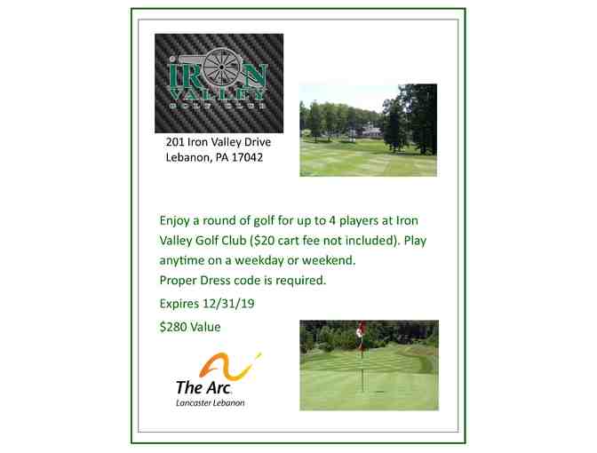 This certificate is good for one round of golf for up to 4 players at Iron Valley Golf Course in Lebanon Pa. Can be redeemed anytime on a weekday or weekend.
