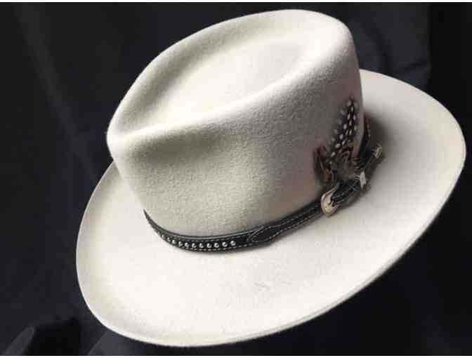 Step up your style with a handmade Western-style, gray, genuine fur felt hat trimmed in a studded charcoal, Western belt with feather from Batsake's Hat Shop. It is satin lined and perfect for ladies or gents! Currently a 7 and 1/4, but can be resized to compliment either sex. (Return for complimentary custom fitting).