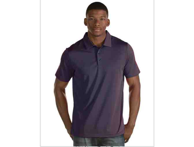 Men's X-Large "Quest" Polo/ Navy with Red Stripes 100% polyester Desert Dry yarn dye auto stripe jersey short sleeve polo with 3-button placket, self collar, side slits, and Antigua patch at right cuff.