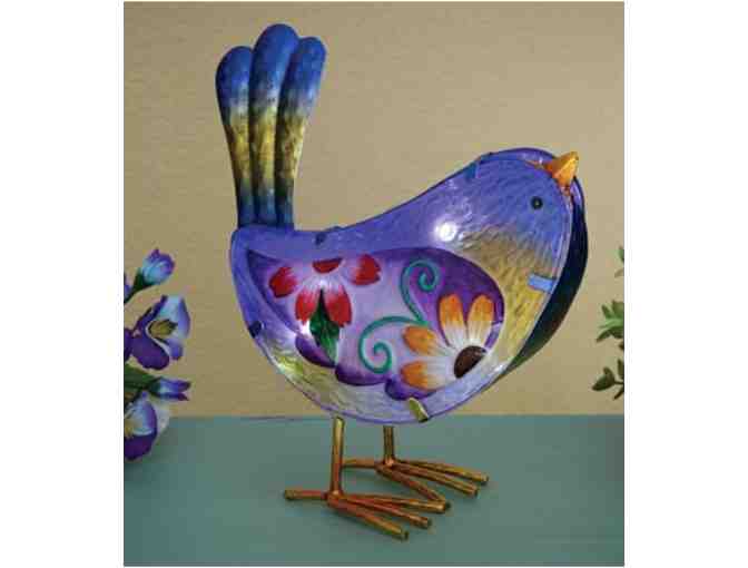 Brighten up your patio this season with our delightful LED bluebird sculpture. Two LEDs illuminate the bird with beautiful reflective color. Wings are embellished with floral details. Made of fused and sculpted acrylic with metal accents. Place in a covered area. Requires 2 button batteries, included. On/off switch on bottom. Measures 7-1/2" x 3-1/4" x 8-3/4".