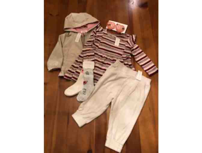 This cute spring ensemble is perfect for any mini fashionista. This outfit includes a light rain jacket, a super soft dress and pant combo, matching socks, and pink heart sunglasses.