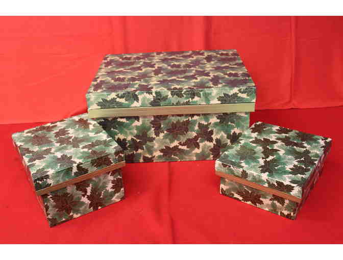 A set of decorative washipaper covered Nori Bako and Cha Bako boxes. The washi paper covering is green and features images of Japanese maple leaves. Box dimensions are equal to 9.75" x 8.5" x 4.75", 9.75" x 8.5" x 6.5", and 19" x 14.5" x 10" inches.