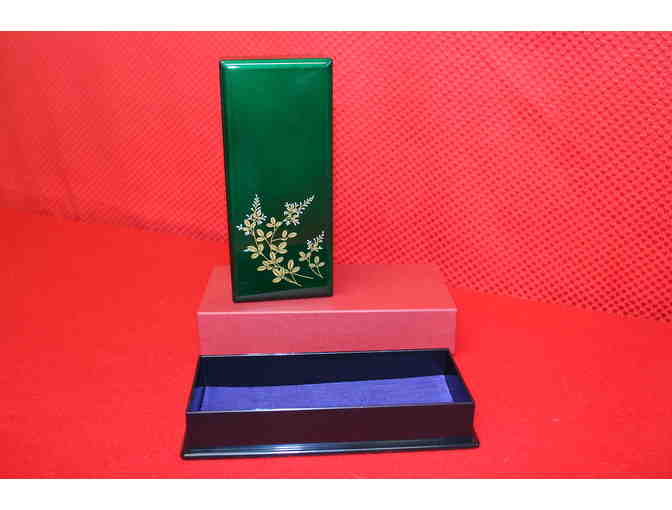 A dark green lacquerware pen case, decorated with pictures of plants and flowers. The box measures approximately 6.25'' inches in length and 1'' inch in height.