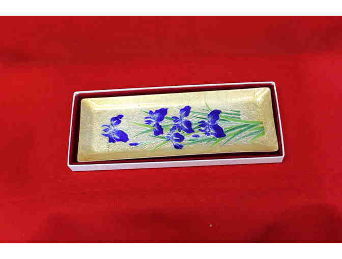 An antique enamelware cloisonne pen rest featuring an image of flowers. Dimensions are equal to 9" inches in length and 3.5" inches in width.