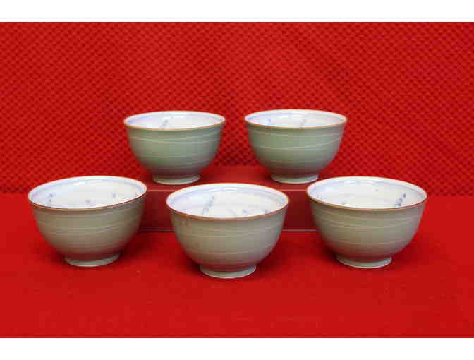 A set of 5 green colored clay tea cups, featuring white interiors with blue illustrations of flowers. Four of the five cups are in excellent condition with slight chipping on the fifth.