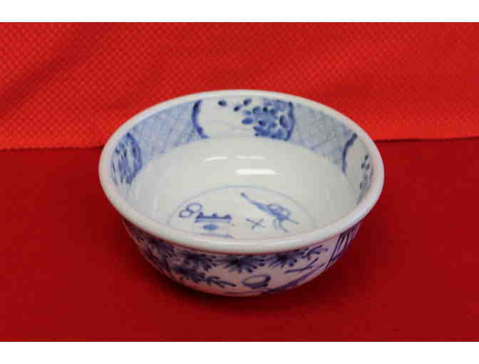 A blue and white porcelain bowl with illustrations of Japanese pottery and plants.