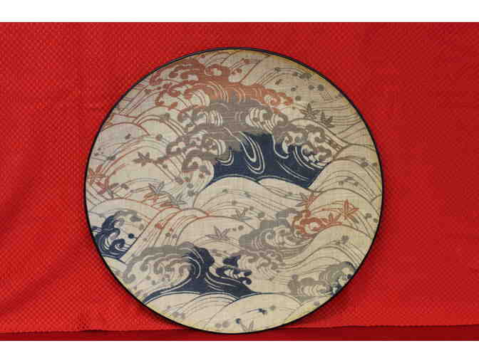 Nishijin fabric - covered platter, 15 1/2 inches in diameter. Nishijin fabric is a traditional textiel produced in the Nishijin district of Kamigyoku in Kyoto. It originiated in the Heian era, more than 1200 years ago.