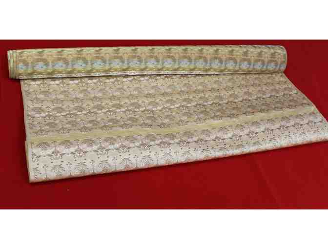 An antique 13' foot length silk fabric used for Kimonos. The fabric alternates between different shades of gold with symmetrical patterns of flowers.