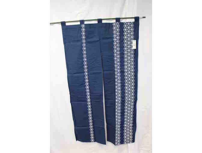 An embroidered noren, a short split curtain usually hung at the entrance of a shop or between rooms in a home in Japan. The dimensions are equal to approximately 60" x 33" inches.