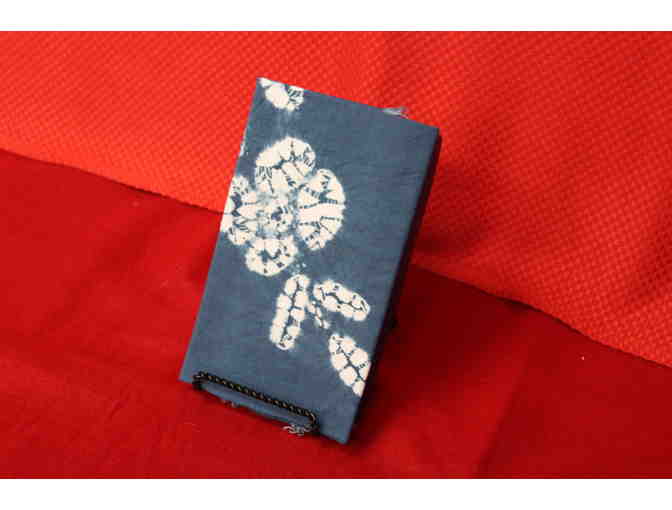 Aizumi traditional blue-dyed decorative cloth featuring illustrations of white flowers and frills along the corners. The dimensions are equal to approximately 15" x 11" inches.