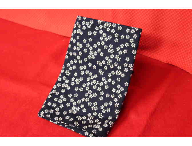 A navy colored furoshiki with cherry blossom illustrations. Dimensions are equal to 19'' x 19'' inches.