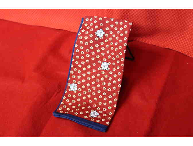 A red and blue furoshiki with rabbit illustration and cherry blossom pattern. The dimensions are equal to 19''x 19'' inches.