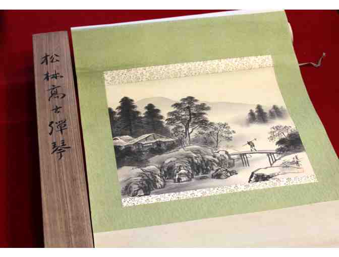 A green colored scroll wall banner, featuring a black and white illustration inspired by Japanese rural life. The wall banner comes within a wooden case with Kanji characters. Dimensions equal 45'' x 21'' inches.