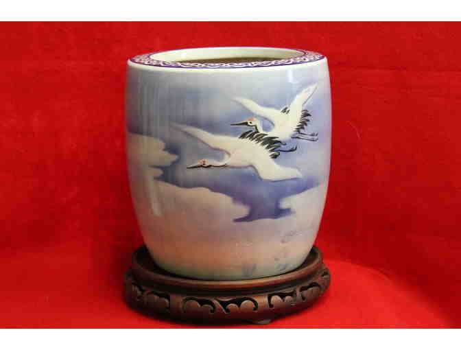 A blue colored vase featuring illustrations a nice winter view of Mount Fuji with trees in the foreground. Backside of vase features two cranes flying. This vase stands at 9'' inches tall with an 8'' inch diameter.