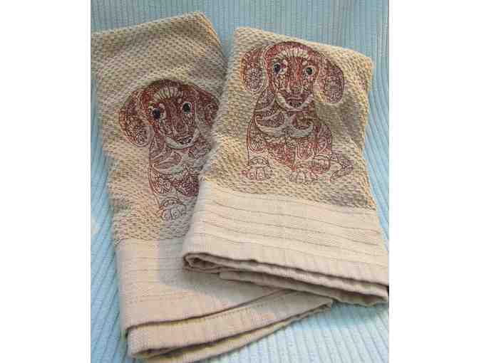 Set of 2 Tan Handtowels with Brown Embroidered Dachshund