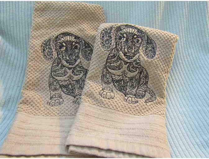 Set of 2 Tan Handtowels with Black Embroidered Dachshund