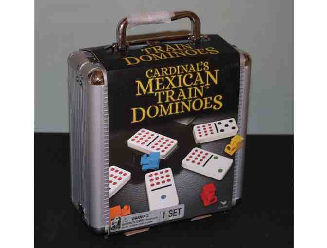 Up for auction is this game of Mexican Train Dominoes - 91 double twelve color dot dominoes, domino hub, 9 plastic trains, score pad, instructions, and aluminum carrying case.