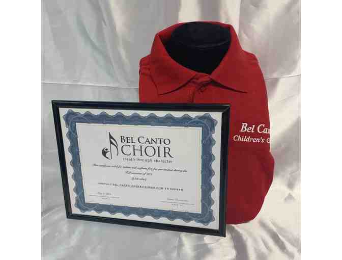 Uniform shirt; Certificate for one child's tuition with Bel Canto Choir Fall of 2019 semester. Bel Canto Choir provides a nurturing and inspiring experience for children who wish to express themselves through performance, develop character and musicianship.