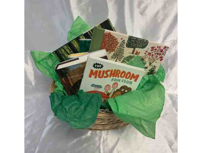 Book basket with "The Mushroom Fan Club" by Elise Gravel; "The Overstory" by Richard Powers; "Nature All Around: Trees" by Pamela Hickman and Caroyln Gavin; "The Hidden Life" by Peter Wohlleben; "The Forest" by Bozzi, Lopiz, and Vidali; "Harry's Trees" by Jon Cohen