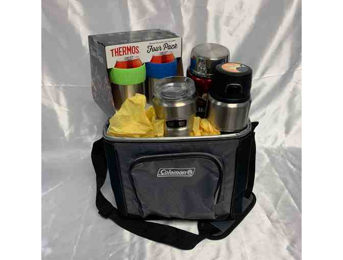 20oz. Stainless King, stainless steel 360° tumbler; food jar w/folding spoon; 24oz. stainless steel hydration bottle; 4-piece 12oz. stainless steel beverage can four pack, one each blue, red, black and lime green; Coleman Cooler