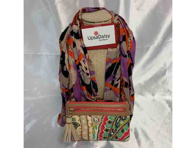 $25 gift card to UpsaDaisy Boutique; Orange and purple scarf; Spring patterned wristlet