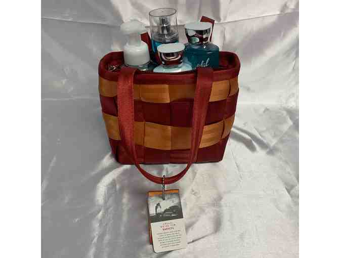 Harvey's orange and red seatbelt purse; Bath & Body Works Beautiful Day set