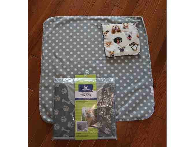 Up for auction is this Pet Toy Box with Blanket and Potholder. The toy box folds for easy storage, measuring 12 inches long x 11 inches high x 12 inches wide. Spot clean with a damp cloth. Easy access for all dog sizes. Blanket measures 23-1/2 inches square.