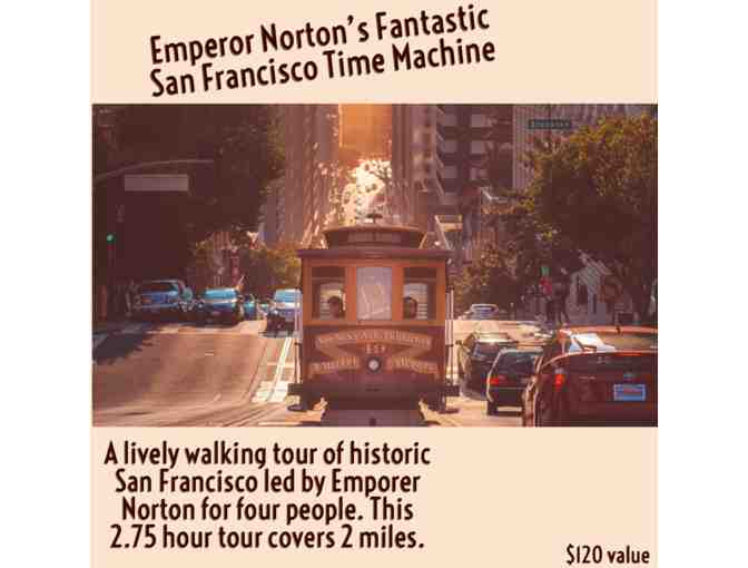 Emporer Norton's Fantatic San Francisco Time Machine is a lively, informative, and entertaining walking tour of historic San Francisco. Led by Emporer Norton for about 2.75 hours covering approximately 2 miles. This tour is for 4 people.