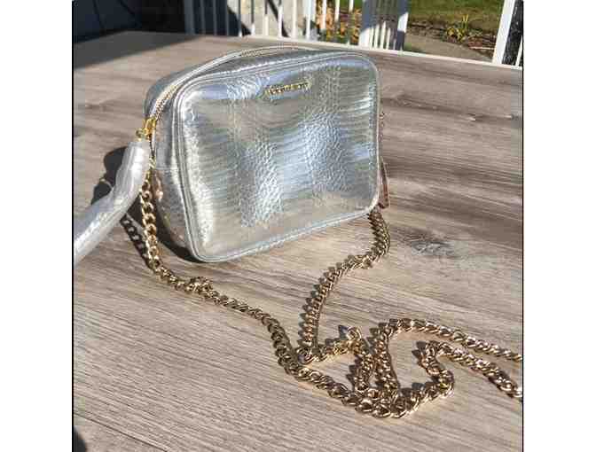 Victoria's Secret Silver Faux Python Metallic Cross Body Bag with Tassel and Gold Chain