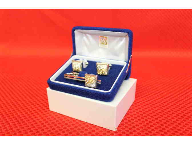 The cufflinks and tie clip are titanium in color with woven silver and gold thread as the main center piece.
