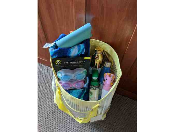 Includes: Beach towel, beach bag, sunglass case, (2) stainless steel water bottles, (2) pairs of goggles, bubbles, (6) pack of neon slime.