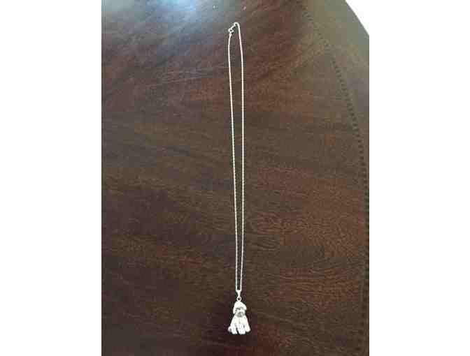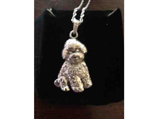 1” silver bichon charm on 24” silver chain. In original box; never worn!