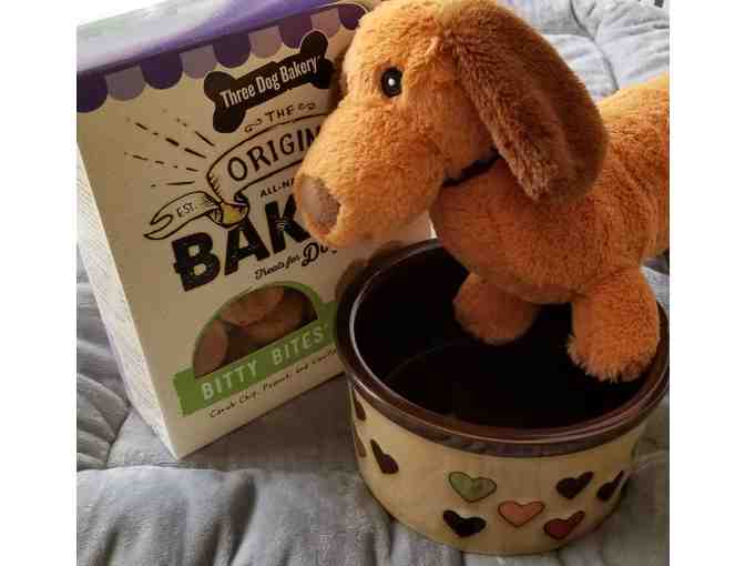 This gift pack contains a heavy 6" round ceramic bowl decorated with multicolored hearts, gourmet dog treats and a 10" dachshund squeaky toy.