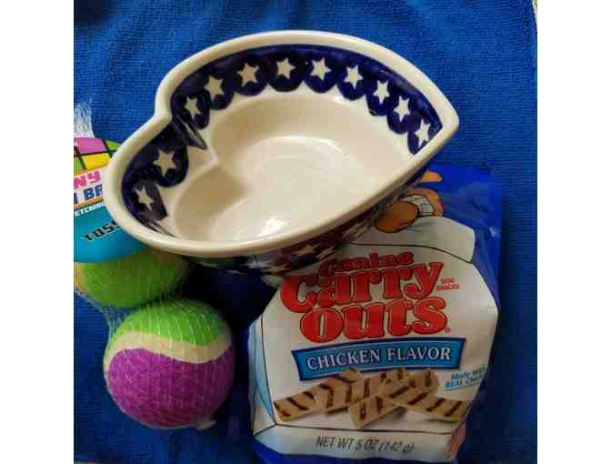 Heart shaped ceramic bowl, colorful fetch balls & yummy treats make up this little package.