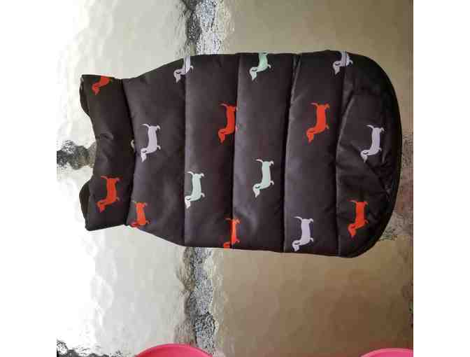 Adorable black down jacket with red and grey dachshund images will have your dog stepping out in style.