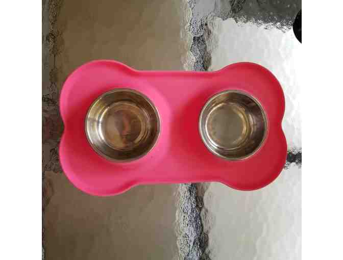 Cute as a button and perfect for your smaller pet. Pink rubber mat to catch drips and drops with two stainless steel bowls for food and water.