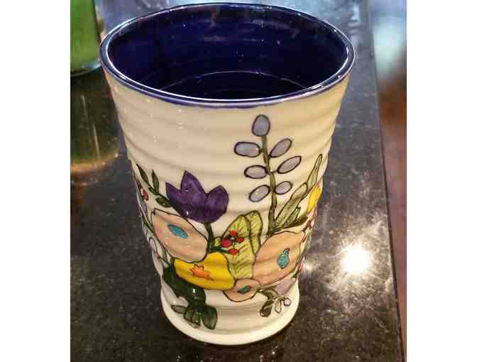 Nicki Reno-Welt fell in love with ceramics in high school and has found various ways to keep her hands in the dirt despite having a “real” day job as a physician assistant in women’s health. In her studio, MudBar, she works mainly with high-fire porcelain clay and throws her pieces on the wheel. After the first firing, she adds the drawings and paintings to the piece using mishima and sgraffito (two fancy words for techniques that are basically different types of carving and glazing.) All of her pieces are dishwasher safe, microwave safe and oven safe (up to 500 degrees) – basically, they are much stronger than most dishes you buy in the store and they are meant to be used!
