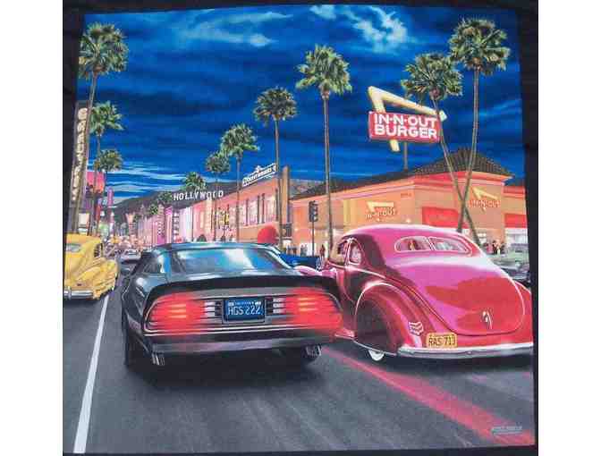 - Black t-shirt with a full-color graphic image (cars cruising with palm trees)