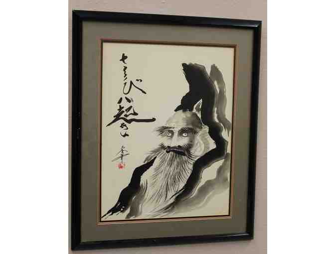 A Sumi-e, traditional Japanese ink wash, painting of an elderly man. Sumi-e paintings utilize black ink like East Asian calligraphy, but in different concentrations to emphasize the brushwork and essence of a subject. Dimensions are equal to 26" x 20.5" inches with frame.
