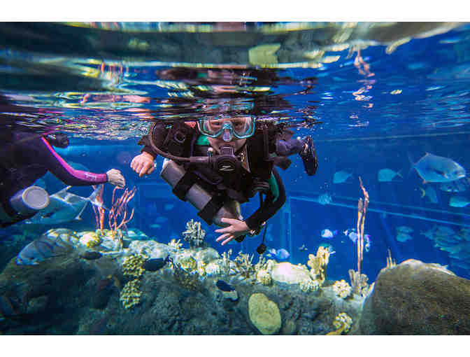 An in-water reef experience for four (4) guests (age6+) that gives you a unique snorkel-likeadventure in the newest aquatic habitat; featuring hundreds of Florida native fishes, sea turtles, bonnethead sharks, and more! Scuba certification not required.This experience is recorded using small action cameras. Guests will receive a copy of this footage after the experience.Admission is included.
