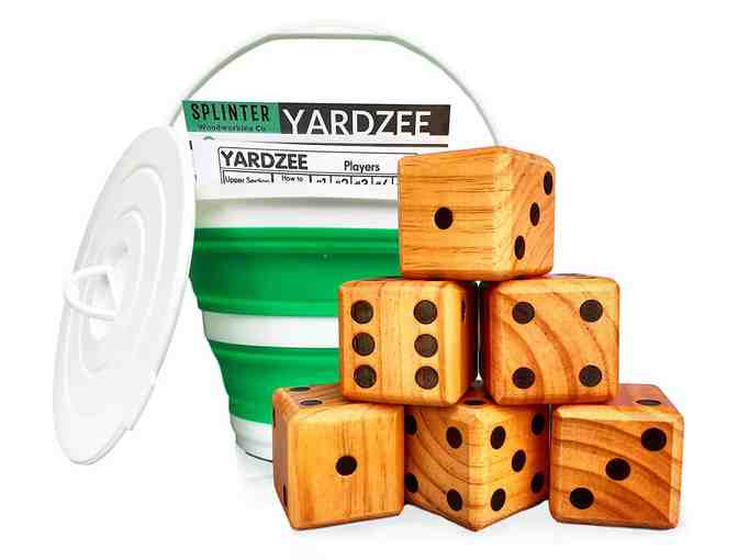 ALL-IN-ONE - All equipment included for Yardzee & Yard Farkle for up to 5 players. Includes 6 solid wood jumbo dice, large reusable score cards, bucket, lid, & marker for a complete yard dice set.